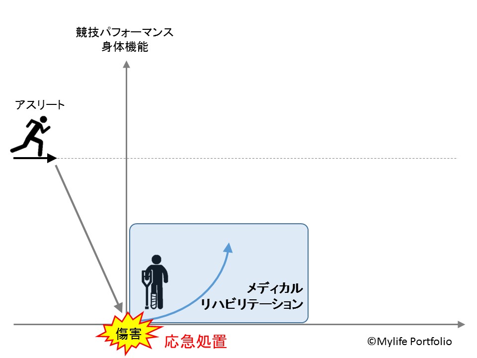 JSPO-ATの役割にある「アスレティックリハビリテーション」、その前段階は「メディカルリハビリテーション」と呼ばれます。