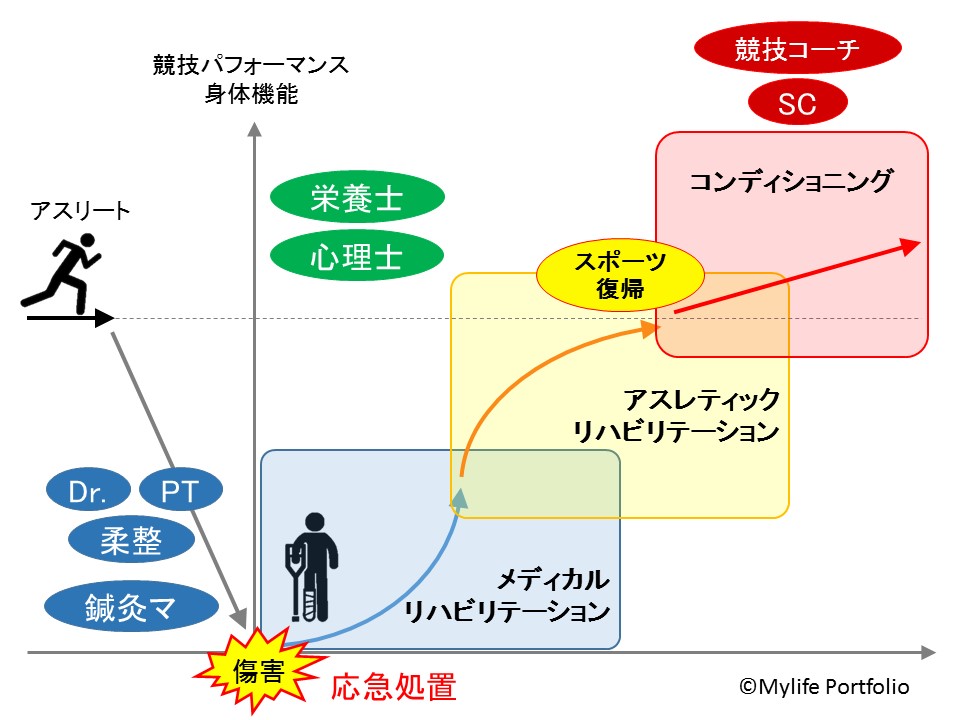 アスリートが受傷した際には医療機関へ行き、ドクターの診察の下、PTの治療によって患部に対してアプローチがなされる。