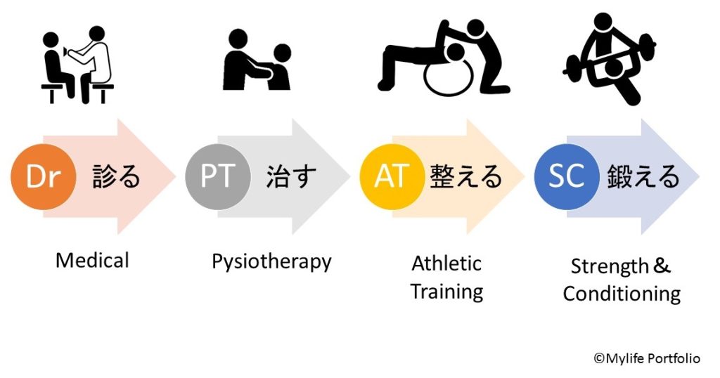 上記のように、医師(Dr.)・理学療法士(PT)・アスレティックトレーナー(AT)・ストレングスコーチ(SC)が各々の役割を分担しアスリートのサポートに臨んでいたようです。