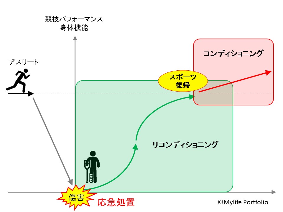 様々な要因(外傷・障害、疾病 、疲労、手術など)によって低下した身体機能、体力、体調およびパフォーマンスを最大限まで向上させ、試合(競技)復帰することを目的とした行為や行動からなるプロセス