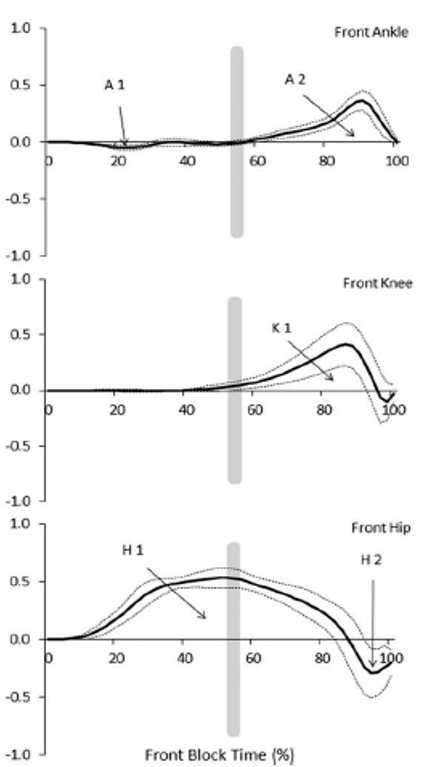 ブロック前脚で行われた全ての正の仕事量(仕事率×時間:グラフで囲まれる免責の部分)のうち、股関節が64±8%・膝関節が21±8%・足関節が15±2%を担っていた。