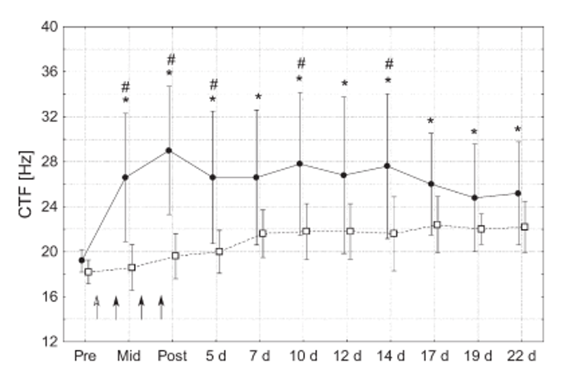 またトレーニング後の経過を追って刺激周波数を比べたところ、14日目まで介入群と非介入群の間に有意差がみとめられた。