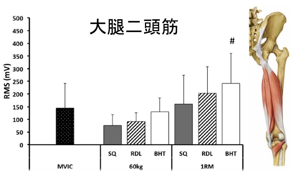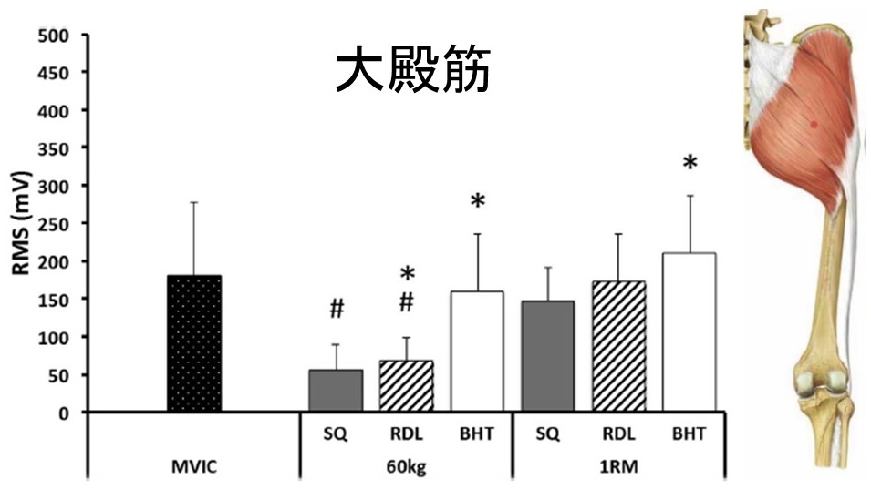 60kg:SQ、RDL、BHTはMVICとの間に有意差なし・RDL、BHTはSQとの間に有意差なし