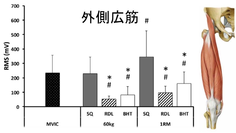 1RM:SQ、RDL、BHTはMVICとの間に有意差なし・RDL、BHTはSQとの間に有意差なし