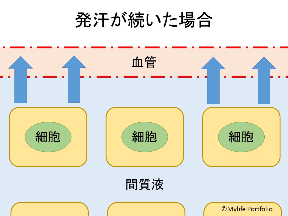 過剰な発汗により、血管内の水分が減少するため、間質液中の水分は浸透圧に従って、血管内に水分が移動していきます。