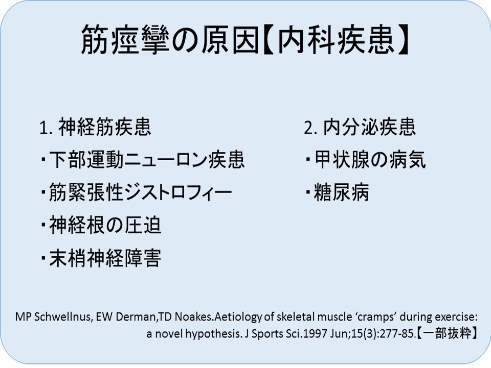 Miller KC, Knight KL. Electrical stimulation cramp threshold frequency correlates well with the occurrence of skeletal muscle cramps. Muscle Nerve. 2009;39(3):364–8.(論文要約)