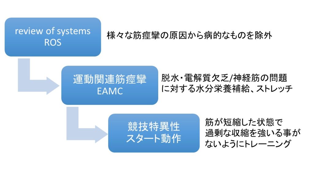 基本的には、病的な疾患を除外したうえで、一般的なEAMCに対する水分・栄養補給やストレッチの対応を行う事が必要です。