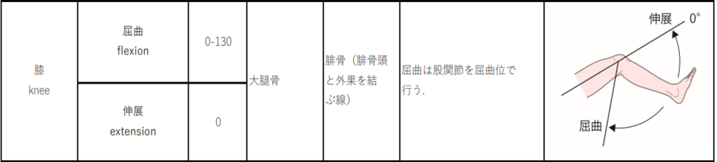 上の図は膝関節の関節可動域の測定法と参考可動域です。真っすぐに膝が伸びきった状態を伸展0°として、膝関節は130°曲がる(屈曲)事が出来るという事です。