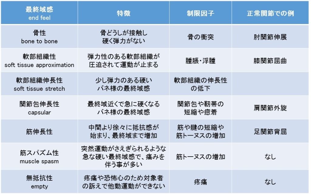 エンドフィールには正常の関節運動で感じられるもの、正常の関節では感じられない異常なものと様々あります。参考までに以下をご覧ください。