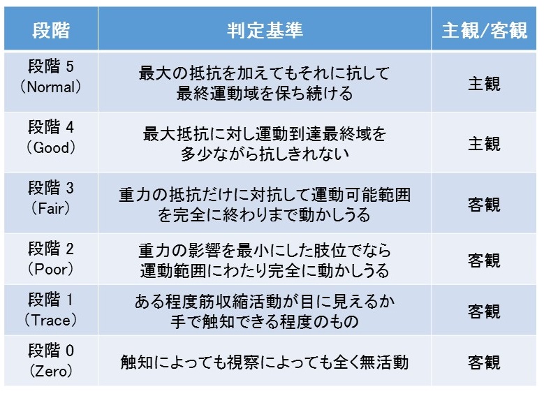 MMTは「5(正常)」から「0(筋活動が全くみられない)」までの6段階に判定づけられます。