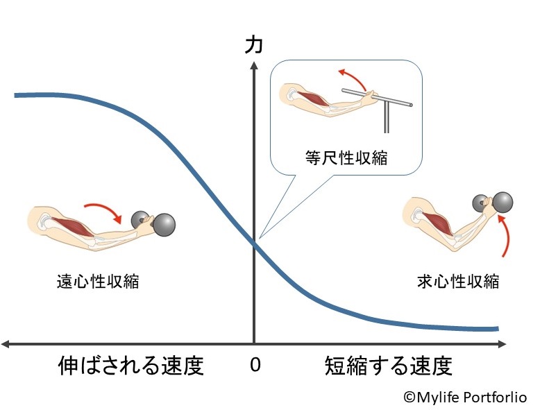 基本的には求心性収縮<等尺性収縮<遠心性収縮の順で筋繊維が発揮できる張力は大きくなっていきます。